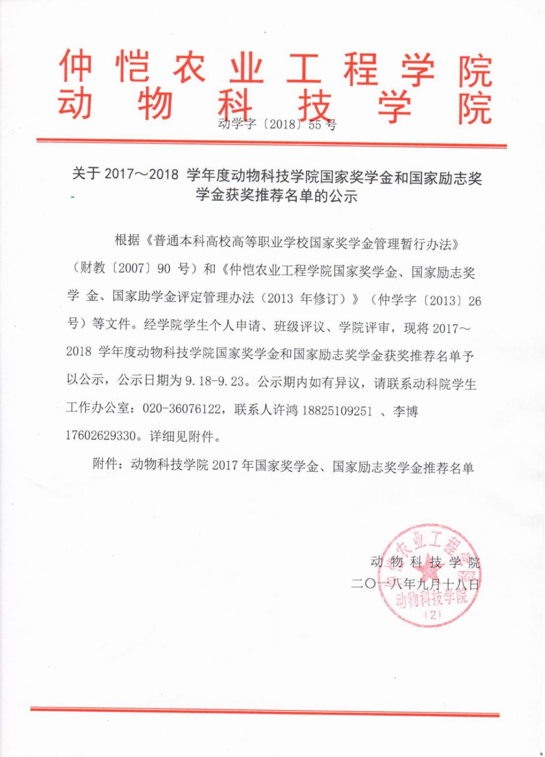 关于公布 2017~2018 学年度国家奖学金和国家励志奖学金获奖学生名单的通知