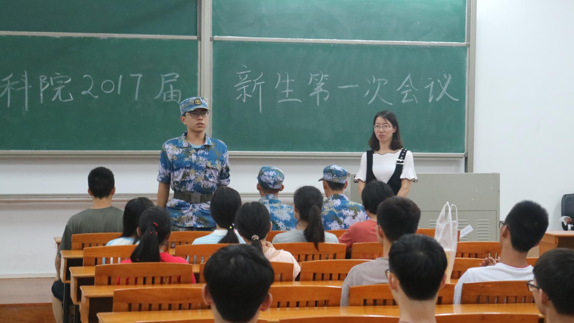 晚上,辅导员沈洁、军训教官和助班与全体新生举行了第一次新生见面会。会上,沈老师强调了安全问题、军训期间的规章制度等。各班级选举了临时负责人。军训教官分班级对新生进行了第一次适应性训练。