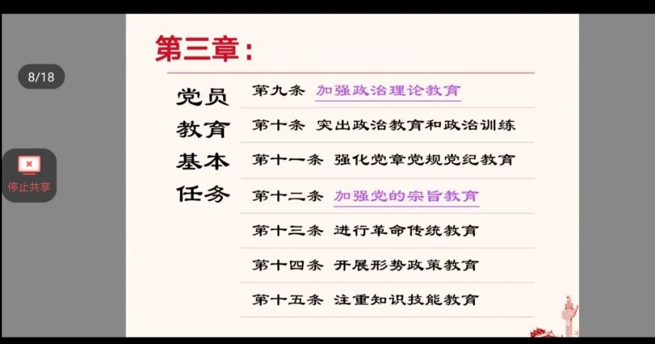 为提高学生党支部委员的业务水平,确保党建工作的有序顺利开展。通过本次会议举办了关于《中国共产党党员教育管理工作条例》、《中国共产党支部工作条例(试行)》、《中国共产党章程》的学习培训。会上由组织委员林婉静带领大家学习《中国共产党党员教育管理工作条例》,明确党员教育是经常性的长时间的工作,应该充分发挥党员的先锋模范作用。宣传委员黄嘉玲同志带领大家学习《中国共产党支部工作条例(试行)》,明确一些日常工作相关注意事项以及重大会议会议的召开时间以及次数,使委员以及党建小组成员对自己的工作职责更加明晰。接着由支委助理何娜同学分享学习《中国共产党章程》有关党支部的职责,明确基层党支部应该坚持从严教育管理和热心关心爱护统一,从政治、思想、工作、生活上激励关怀帮扶党员等相关内容。会议最后与会人员讨论所学知识,发表个人见解。