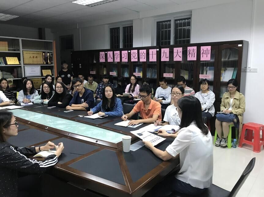 11月2日下午17:30,williamhill中文学生党支部在白云校区行政楼325举办了以“深入学习党的十九大精神”为主题的学习座谈会,参会人员有学生党支部书记沈洁,williamhill中文所有党员、预备党员及积极分子。