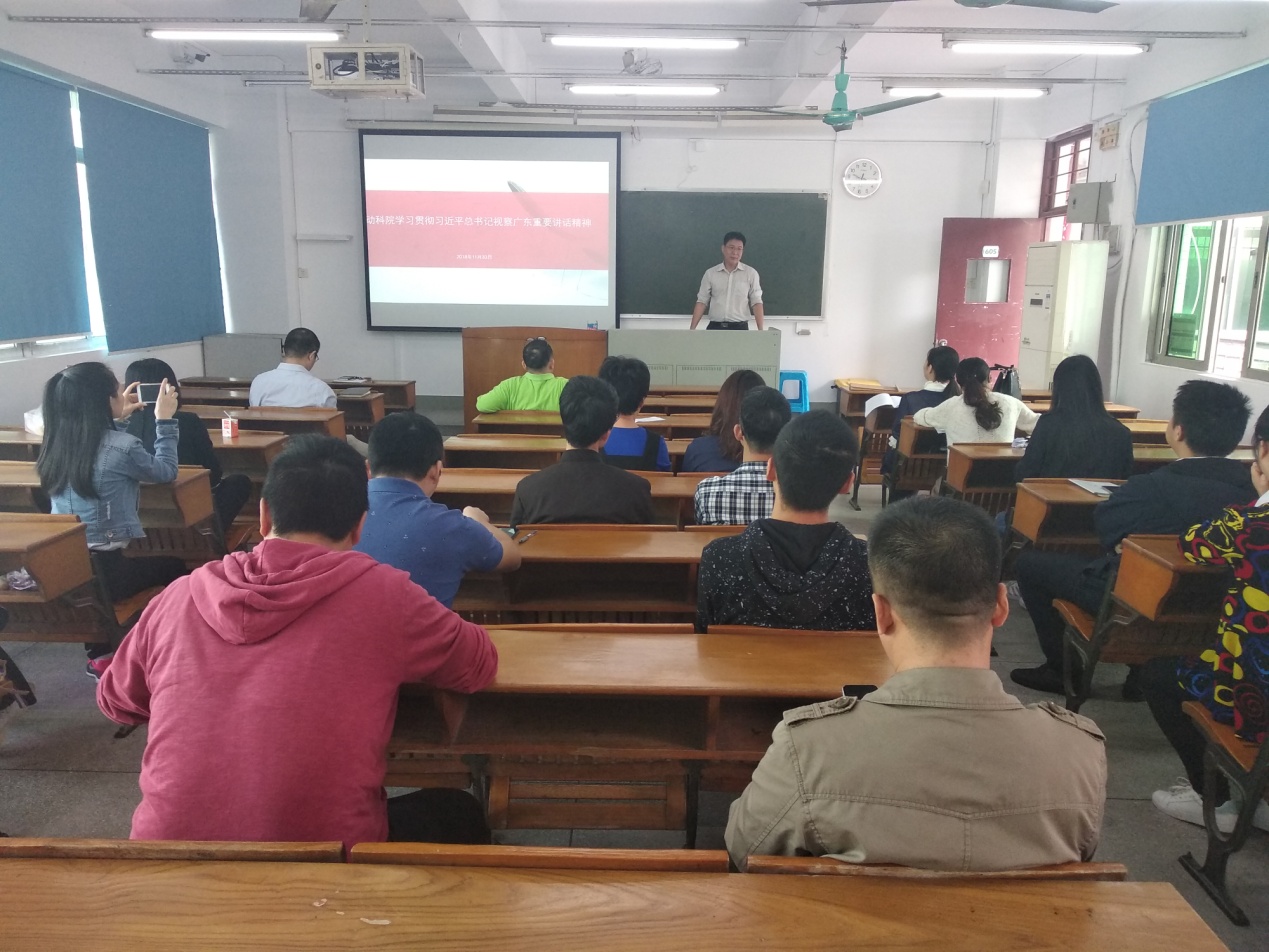 2018年11月30日上午,williamhill中文党总支书记欧坚泉在海珠校区教学楼605为williamhill中文全体教工党员做了《动科院学习贯彻习近平总书记视察广东重要讲话精神》的专题讲座。