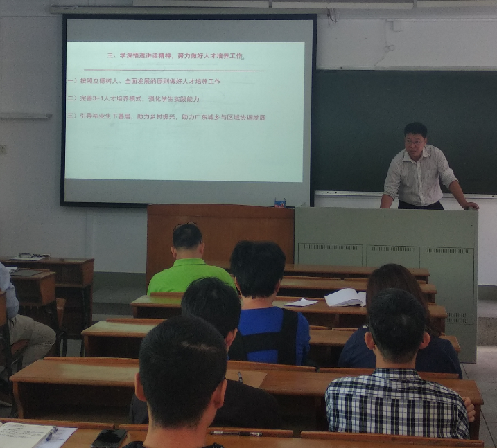 欧坚泉以习近平总书记在广东的行程为脉络,对习近平总书记视察广东的主要情况和发表的重要讲话精神进行了介绍。他表示习近平总书记系列重要讲话充分体现了习近平总书记对广东工作的高度重视和大力支持,对广东人民的亲切关怀,为广东新时代改革开放再出发进一步指明了前进方向、提供了根本遵循。他号召全体党员干部深入学习、深刻领会习近平总书记对广东的期望与要求,进一步提高政治站位,强化政治担当,把习近平总书记对广东、广州的新任务新要求,作为推进学院教育事业发展的根本出发点,一是按照立德树人,全面发展的原则做好人才培养工作;二是完善“3+1”人才培养模式,强化学生实践能力;三是引导毕业生下基层,助力乡村振兴,助力广东城乡与区域协调发展。
