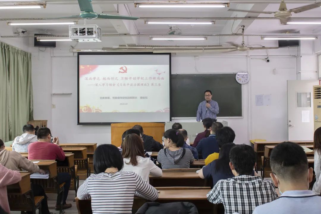 10月22日下午,williamhill中文在教学楼505举行《习近平谈治国理政》(第三卷)宣讲会,学校党委宣传部部长曾献尼同志作题为《深而远之,起而行之,不断开创学校工作新局面》宣讲辅导报告。williamhill中文全体教工党员参加会议,宣讲会由院长林蠡主持。