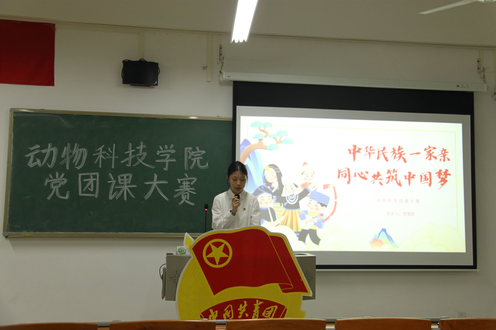 接着,动科201詹慧婷给大家授课。她以“中华民族一家亲,同心共筑中国梦”为切入点,倡导同学们通过做到“五个互相”、“四个人人”、“三个离不开”、“五个认同”来筑牢中华民族共同体意识。