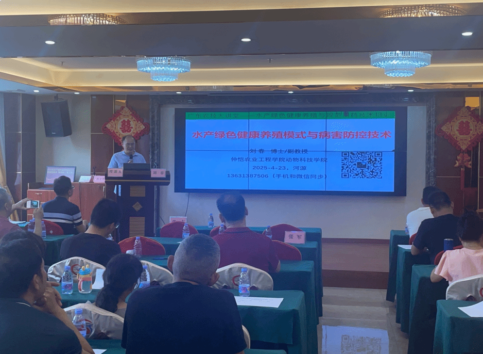 培训会上,刘春作了题为 “广东农技大讲堂暨水产绿色健康养殖模式与病害防控技术” 的报告。他首先深入剖析了我国现阶段水产绿色健康养殖模式的发展现状以及水产动物病害的总体概况。随后,他结合当地水产养殖的实际情况与存在的问题,向在场人员全面且细致地讲解了水产养殖病害绿色生态防控的策略,同时针对养殖户们遇到的难题,给出了的解决措施建议,为养殖户们送上了一堂干货满满的实用课程。