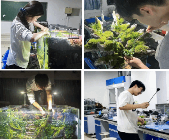 备赛期间,参赛选手在老师的指导下,从主题构思、材料筛选到景观搭建,精心打磨每一个环节。比赛采用“异地造景、同步呈现、实时互动”的模式,自9月27日启动,选手们依据设计方案,完成景观骨架搭建,再通过水草的精心布局与栽植,构筑出富有生机的水下景致,造景完成后进入为期一个月的养护阶段,并于11月1日赴西南大学进行现场汇报和专家组打分评选。在激烈比赛中,我校学子凭借扎实的专业功底和良好的团队协作精神脱颖而出,展现了积极向上、勇于挑战的精神风貌。