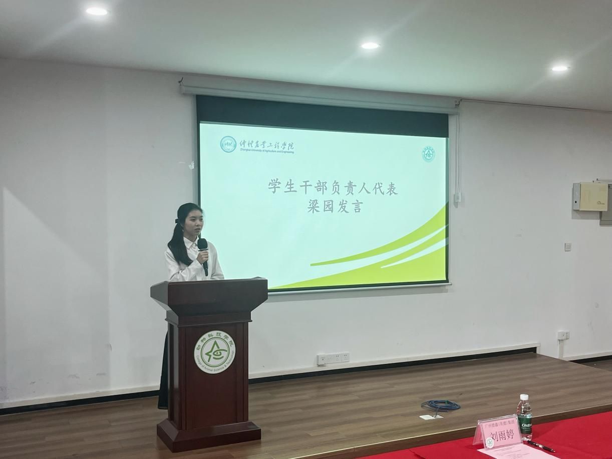 学生干部负责人代表梁园,介绍了科技文化节系列活动的前期筹备情况,她表示作为动科院学子,要深耕专业知识、夯实学业基础,同时主动加强科技创新能力培养,积极参与各类科创实践活动,以青春之姿践行“学农爱农、强农有我”的使命担当。