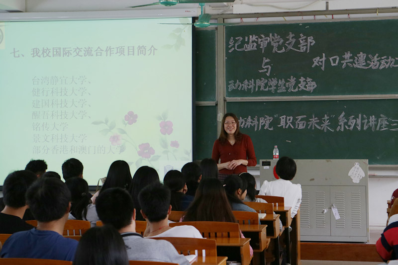 3月31日下午14时,williamhill中文学生党支部与纪监审党支部结对共建的第二场活动,在白云校区杨楼206教室举行。纪监审党支部委员、外事处处长姚圣梅教授,为动科院学生党员、入党积极分子、15级全体学生,做了题为《大学生涯与国际交流》的讲座。学生党支部书记沈洁老师主持。