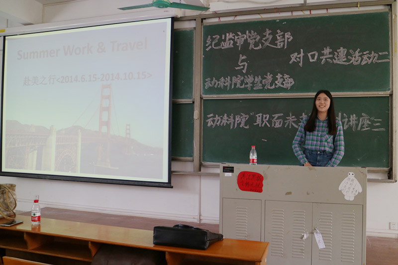 姚老师从大学生职业生涯规划的角度出发,提出一个新的发展视角:即赴境外开展交换或交流学习,从而开拓眼界、增长阅历,培养独立能力、锻炼外语水平。姚老师还重点为同学们介绍了与我校建立合作的英国、美国、新西兰等国优秀大学的项目。外国语学院13级学生杨阳作为已参与过对外项目的学生,也来到现场与动科院学生们交流经验。