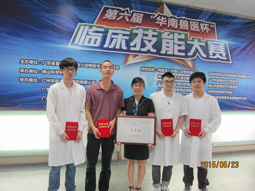 5月23-24日,由广东省畜牧兽医学会小动物医学专业委员会主办的第六届“华南兽医杯”临床技能大赛拉开战幕。本届比赛由佛山科学技术学院承办,分职业组、高校组和中职组进行。由古飞霞老师领队、唐军老师指导、动物科学2012级学生邹创智、廖嘉俊和汪祥斌组成的我校代表队参加了高校组比赛。经过紧张角逐,获得高校组二等奖。