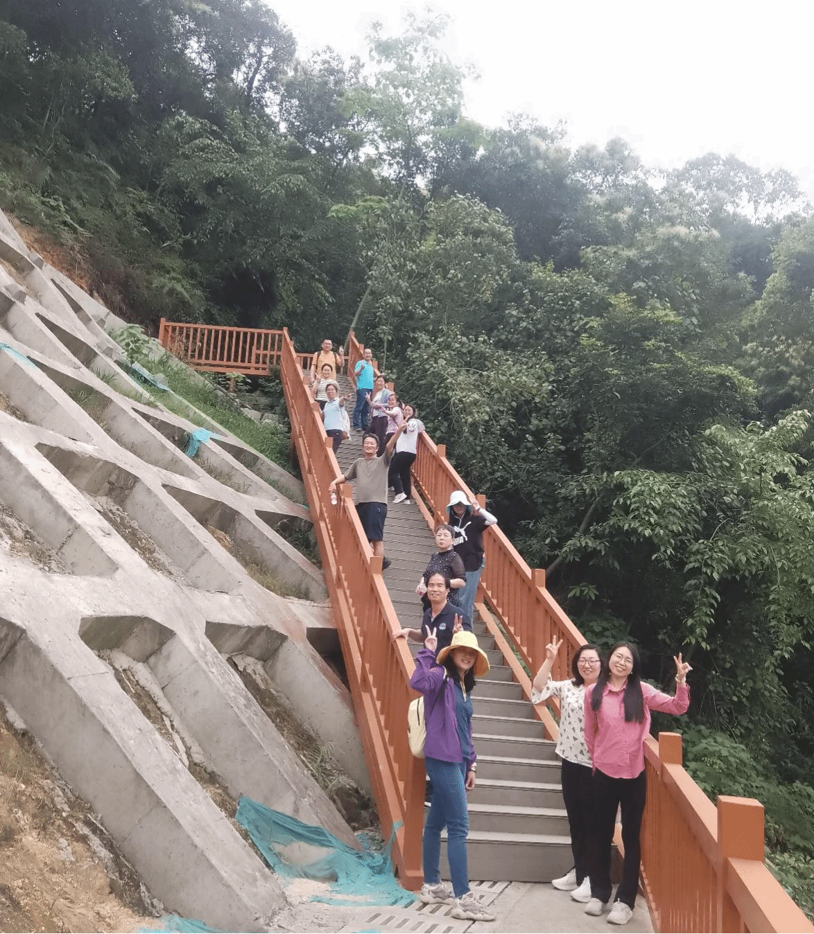 王子山森林公园负离子含量高,树高林密,溪水清澈。老师们乘车到达后,沿着台阶往上爬,一路上苍竹青翠,浓荫蔽日,耳边不时传来鸟鸣和蛙声,大家谈天说地,欢笑声不绝于耳,体力好的老师约一个小时到达山顶,体验到山顶浩瀚绮丽的风景。