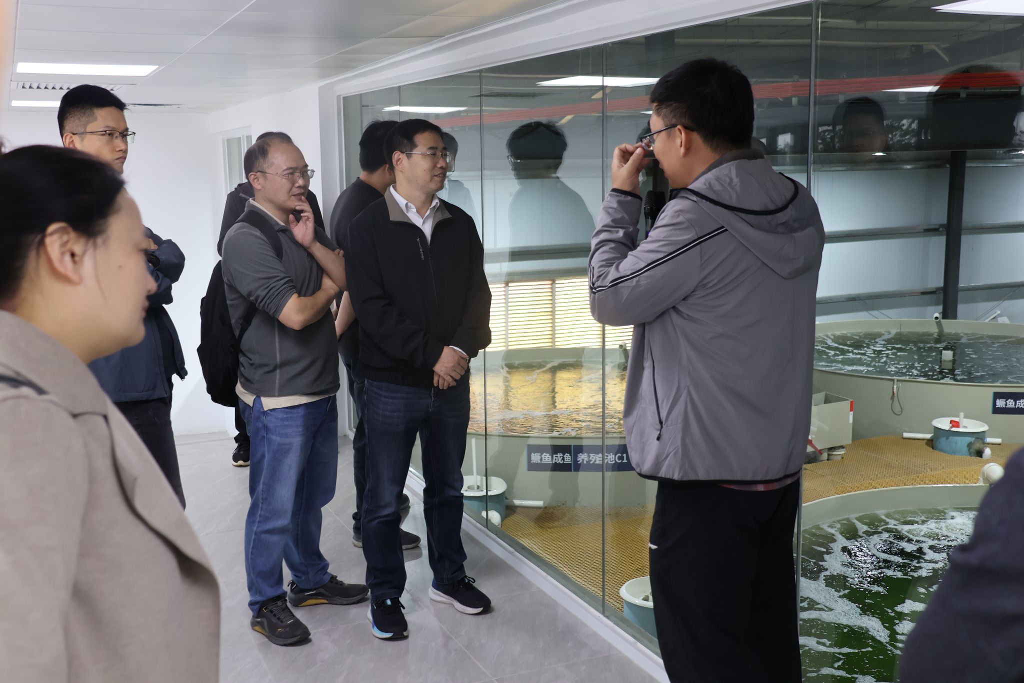 广州南沙渔业产业园有限公司副总经理陆君带领参观,并详细介绍了南沙渔业产业园发展历程和建设情况,学院教师一行实地参观了园区标准化鱼塘、大数据管理中心、鳜鱼智慧化养殖车间,了解了南沙青蟹、诚一鲜皖、斑节对虾等优质水产品,对池塘工程化循环推水养殖技术、智能化综合养殖模式、南沙农业渔业发展现状以及未来的发展趋势有了更深入的认识。在参观过程中,双方就科研攻关合作、学生实习就业等深入交换了意见。