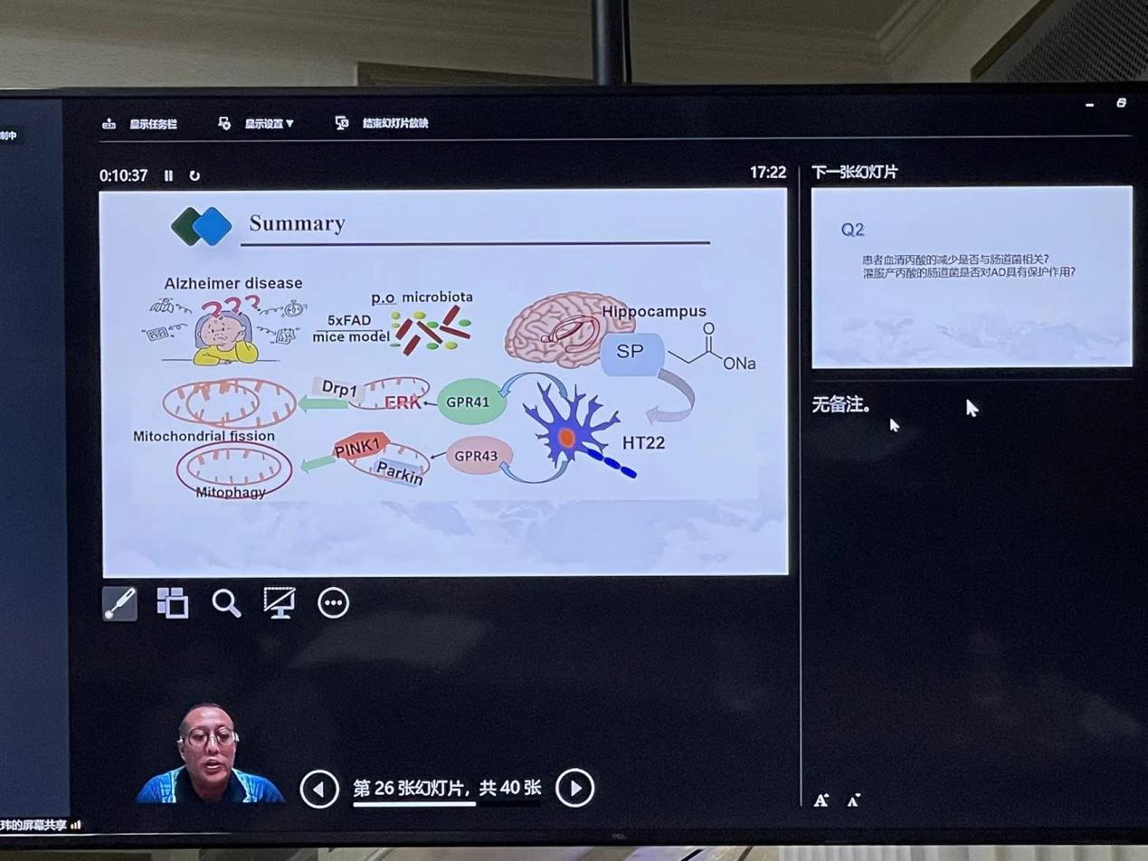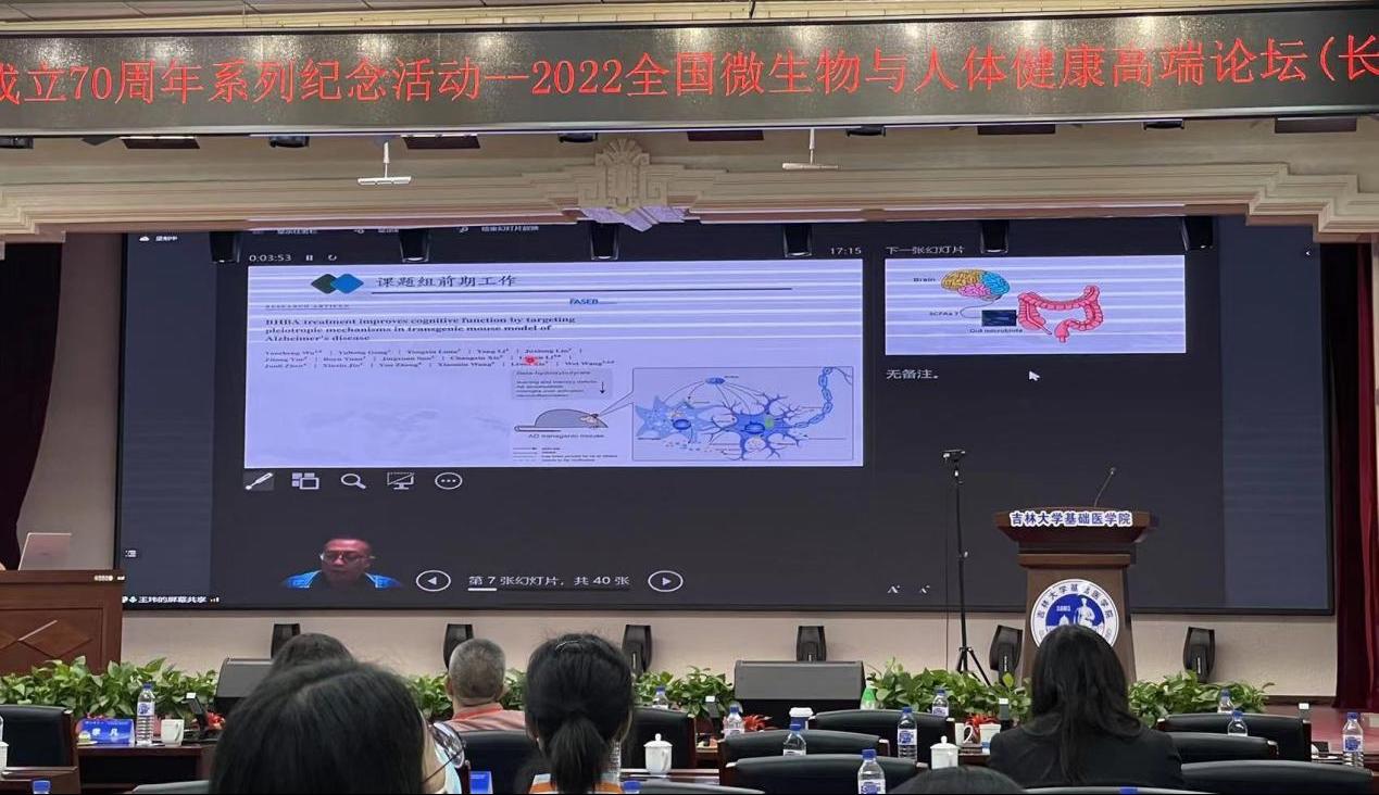 王玮教授以“通过肠道微生物群靶向线粒体功能障碍能否成为阿尔茨海默病干预的新方法?”为题,从AD 患者、AD 小鼠模型和离体神经元细胞三个层面,系统探讨了在短链脂肪酸给药和肠道微生物移植对阿尔茨海默病动物模型的保护作用及作用机制,介绍了我校健康养殖创新研究院营养免疫调控研究团队在微生物与健康领域的研究基础与最新研究成果。本次学术论坛,线上线下凝聚了一批中国生物医学领域的优秀的科学家。专家及参会者们围绕微生物学国内外的最新研究成果进行了充分的交流和探讨。王玮教授参加此次会议并进行大会汇报,充分展示了我校在微生物领域及健康领域的研究特色及研究成果,也反映出我校在微生物基础研究领域的水平。