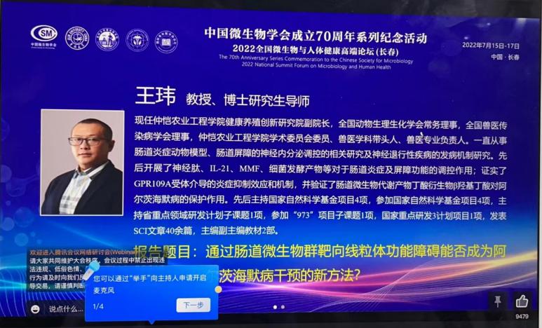7月15日至17日,在中国微生物学会成立70周年之际,由中国微生物学会医学微生物学与免疫学专业委员会、吉林大学基础医学院及上海交通大学医学院全球健康学院共同主办,国际老年医学杂志社承办的2022全国微生物与人体健康高端论坛在吉林大学基础医学院举办。我校williamhill中文动物医学系王玮教授受邀线上做大会报告分享了最新的研究进展。