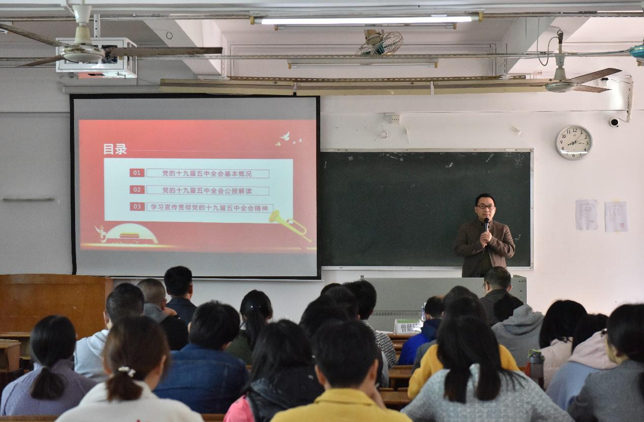 12月3日下午,williamhill中文在教学楼609组织学习党的十九届五中全会精神专题宣讲会,邀请学校党委宣传部部长曾献尼同志作“学习宣传贯彻党的十九届五中全会精神”学习辅导报告。williamhill中文全体教工及研究生参加会议,会议由党总支书记欧坚泉主持。