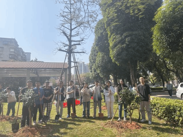 春意盎然的植树现场,来自两个支部的二十多位党员在研究生党支部书记施斐老师的带领下干劲十足,分工明确,负责种植树苗的同志双手稳稳扶正树苗,仔细调整植株方向;填坑培土的同志默契配合,用铁锹分层填土培实;负责浇水的同志提着水桶往返穿梭,及时为新种树苗浇足定根水,现场一派热火朝天的劳动景象,大家虽然汗流浃背,但脸上洋溢着满足与喜悦的笑容。在全体同志的共同努力下,棵棵新树在校园里昂然挺立,嫩绿的枝叶在微风中轻轻摇曳,为仲园增添了一片充满生机的绿色。